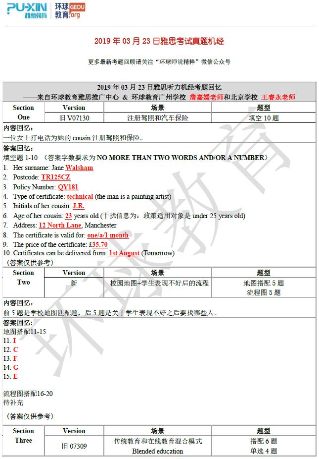 2019年3月23日的雅思听力考试中一类新题:校园地图+学生表现不好的流程,三类旧题:注册驾照和汽车保险、传统教育和在线教育混合模式、中东地区的新式地下水灌溉系统。